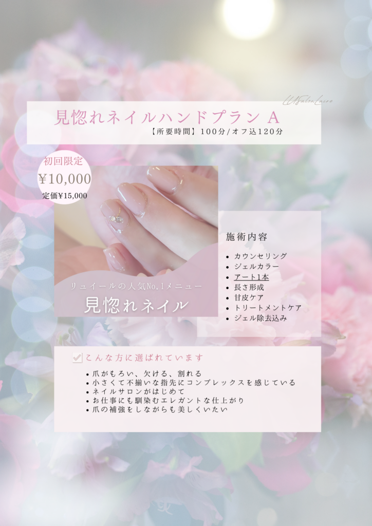 【2回目以降】前回のジェルの定着状態をチェックします。指先に感じる重たさや不快感、伸びた時の不便さがないかどうか、生活の変化の有無や体調などお伺いして、必要に応じて使用する材料の見直しを行います。