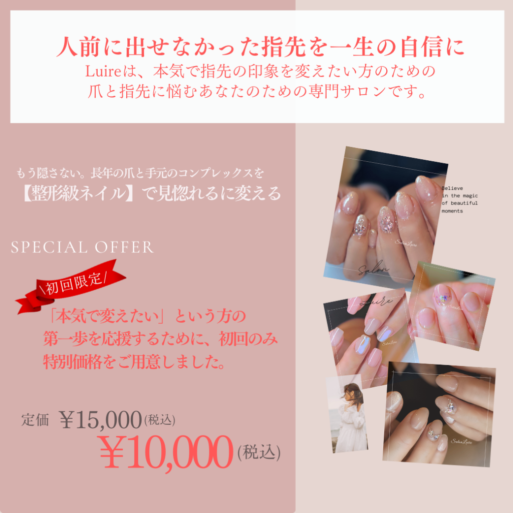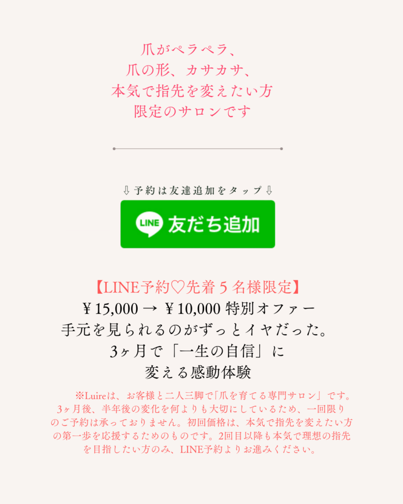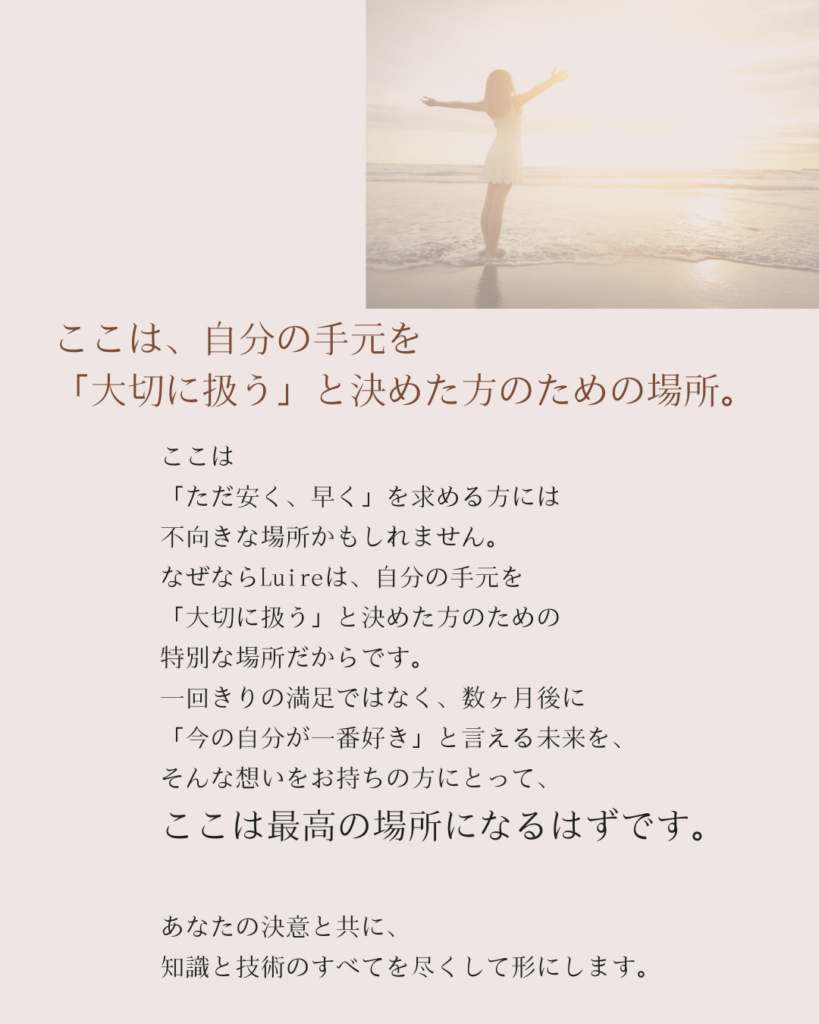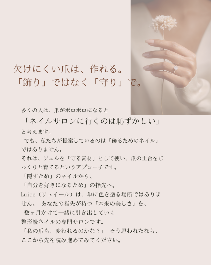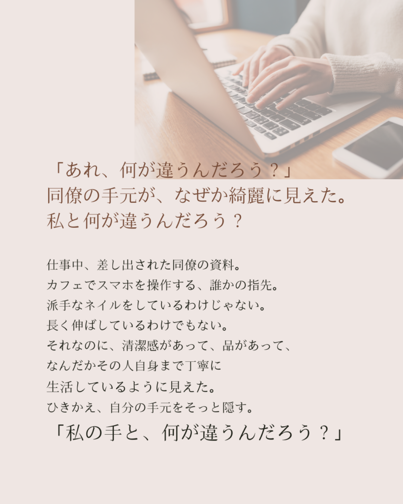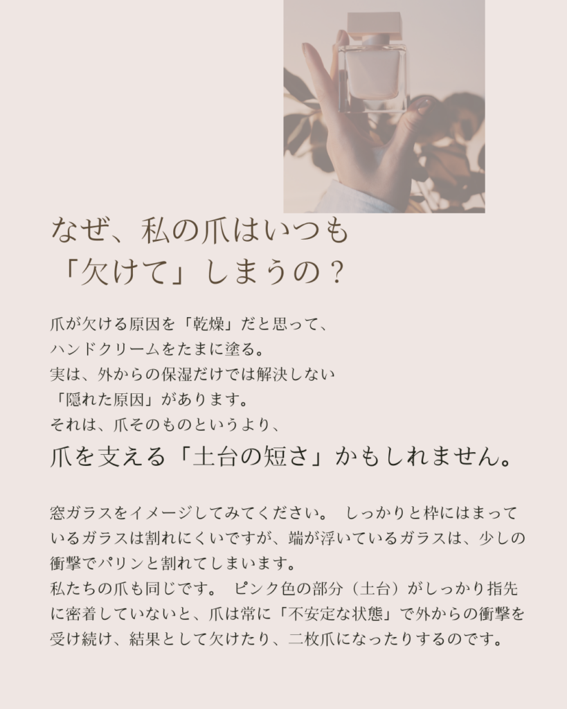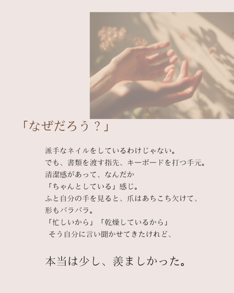 【初回ご来店時】爪と爪周りの肌の状態の観察、お仕事や生活の中での指先の使い方などをお伺いしてから使用する材料の選定をします