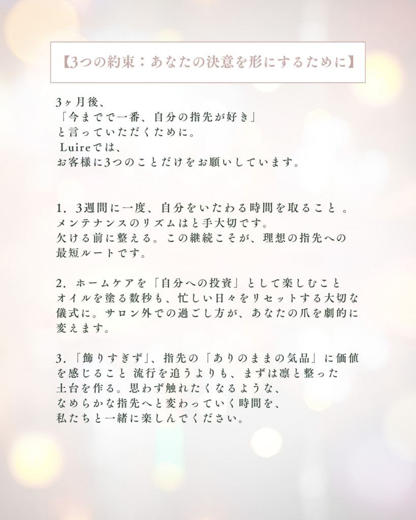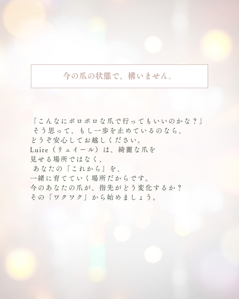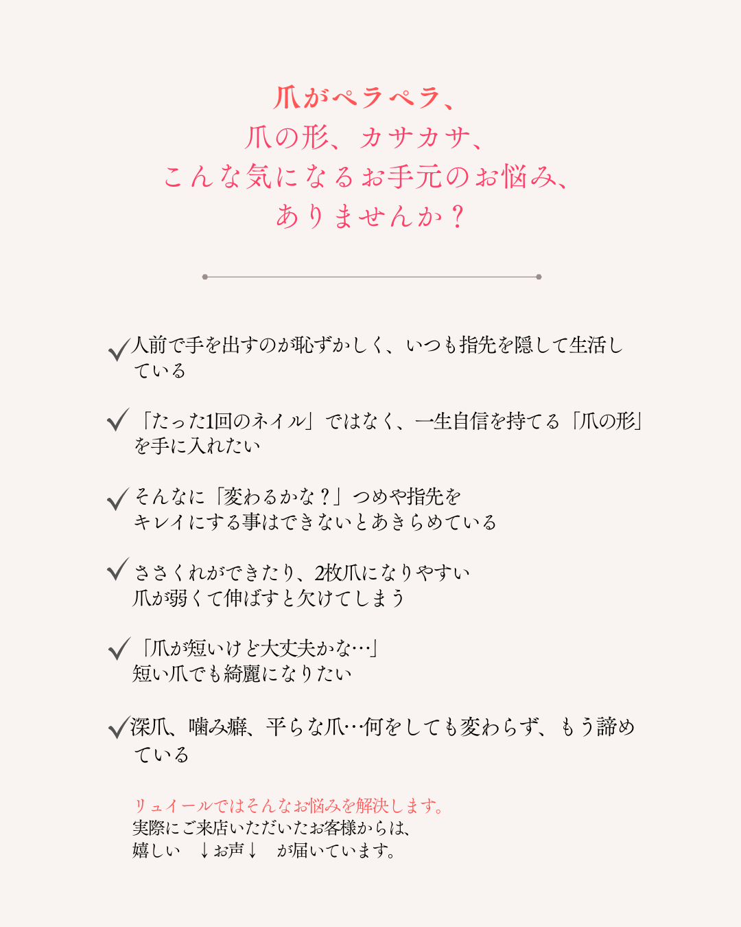 【2回目以降】前回のジェルの定着状態をチェックします。指先に感じる重たさや不快感、伸びた時の不便さがないかどうか、生活の変化の有無や体調などお伺いして、必要に応じて使用する材料の見直しを行います。